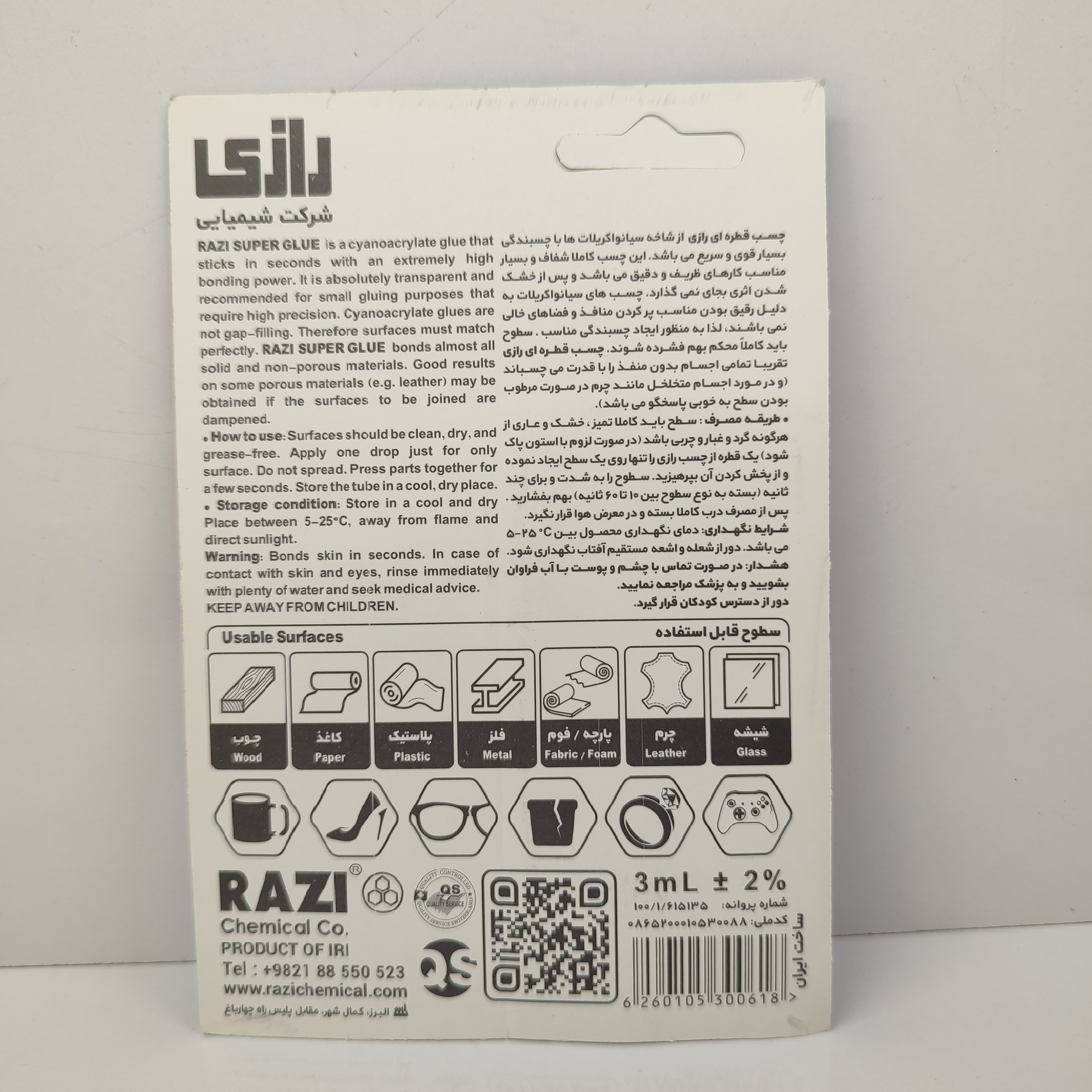 چسب قطره ای رازی از شاخه سیانواکریلاتها با چسبندگی بسیار قوی و سریع میباشد. این چسب کاملا شفاف و بسیار مناسب کارهای ظریف و دقیق میباشد و پس از خشک شدن اثری بجای نمی گذارد چسب های سیانو اکریلات به دلیل رقیق بودن مناسب پر کردن منافذ و فضاهای خالی نمی باشند لذا به منظور ایجاد چسبندگی مناسب . سطوح باید کاملاً محکم بهم فشرده شوند. چسب قطره ای رازی تقریبا تمامی اجسام بدون منفذ را با قدرت می چسباند و در مورد اجسام متخلخل مانند چرم در صورت مرطوب بودن سطح به خوبی پاسخگو میباشد طریقه مصرف : سطح باید کاملا تمیز خشک و عاری از هرگونه گرد و غبار و چربی باشد در صورت لزوم با استون پاک شود یک قطره از چسب رازی را تنها روی یک سطح ایجاد نموده و از پخش کردن آن بپرهیزید. سطوح را به شدت و برای چند . ثانیه بسته به نوع سطوح بین ۱۰ تا ۶۰ ثانیه بهم بفشارید